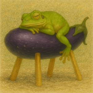 ナスを椅子のようにして眠るカエル。