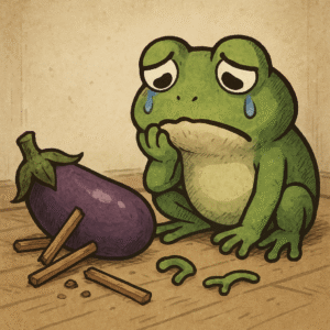 ■ ④ 朝の悲劇:ナス蛙、落下して木材と足指が崩壊