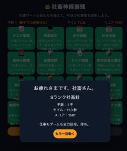 揃えるとスコアが入り、時間・手数と合わせて社畜ランクが確定: